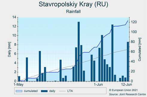 Обильные дожди продолжались в большинстве регионов выращивания озимых зерновых, особенно в Центральном, Южном и Северо-Кавказском округах. В течение рассматриваемого периода (с 1 мая по 12 июня) кумулятивные осадки были примерно на 40% выше LTA в Центральном и Северо-Кавказском округах и на 70% выше LTA в Южном округе. В результате высокий уровень влажности почвы создал многообещающие условия для урожайности озимых культур, но избыточная влажность может привести к ухудшению качества зерна.