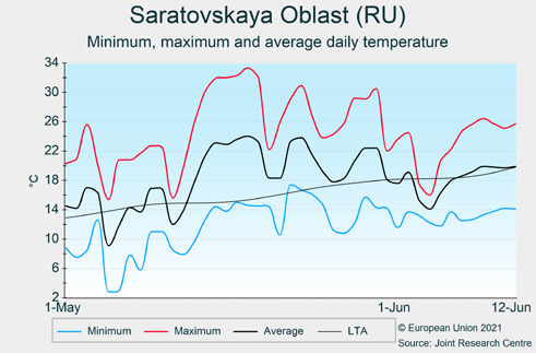 В мае на юго-западе России температура в среднем была немного выше LTA, но с сильными колебаниями. С начала июня температуры падали, а суточные максимумы редко превышали 25 ° C, что благоприятно для фазы наполнения зерна озимых культур. В Приволжском округе на протяжении всего периода обзора преобладали температуры значительно выше средних (+3 ° C по сравнению с LTA).