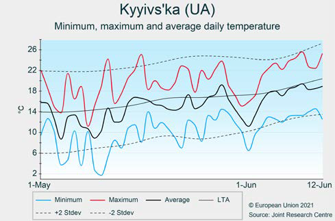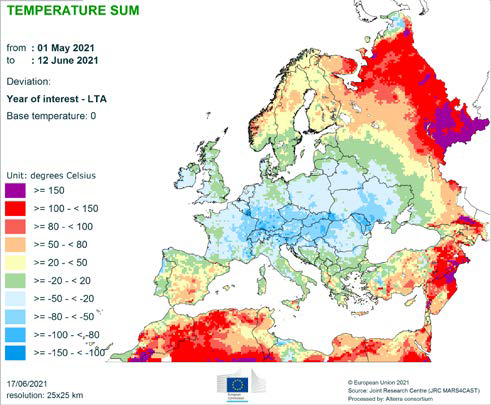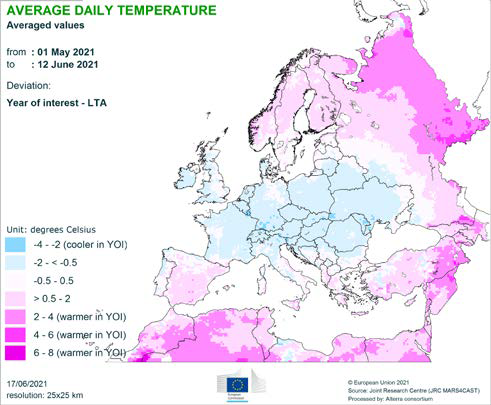 Несколько более холодные, чем обычно, условия наблюдались в большей части Европы с аномалиями среднесуточной температуры (по отношению к LTA) от -2 ° C до -0,5 ° C. Всю весну преобладала необычная череда заморозков, в результате чего апрель 2021 года оказался среди трех самых холодных апрелей в историческом архиве MARS (начиная с 1979 года) в центральной и северо-западной Европе. Эти более холодные, чем обычно, погодные условия также отражаются в больших отрицательных аномалиях накопленной температуры со значениями в основном от -150 ° C до -100 ° C и более -150 ° C в обширном поясе, который простирается от Нидерландов в сторону Украины. Исключительно большое количество холодных дней (более чем на 80% превышающее LTA) было также зарегистрировано в большой части Европы.