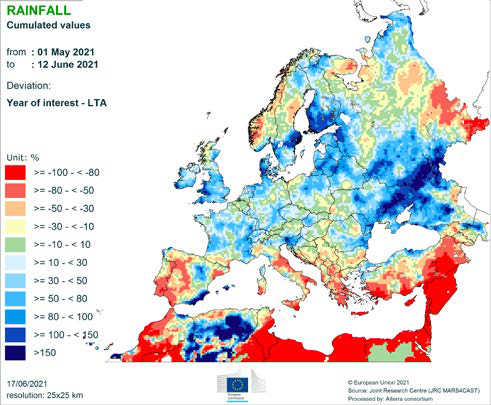 В течение рассматриваемого периода в больших частях Европы погодные условия были близки к средним. Значительно более низкие, чем обычно, температуры в начале мая (как сообщалось в майском бюллетене) постепенно уступили место температурам средним или выше среднего, за исключением южной и юго-восточной Европы, где температуры оставались немного ниже долгосрочного среднего значения (LTA). В Западной Европе более высокие температуры ускорили фенологическое развитие озимых и яровых зерновых культур; после небольшой задержки они сейчас находятся на средней (Франция) и слегка опережающей стадиях (Германия) развития. Такого восстановления пока не наблюдается на Британских островах, где посевы немного отстают в развитии. В Центральной Европе сохраняющиеся более низкие, чем обычно, температуры поддерживали задержку в развитии посевов, но с другой стороны снижали их потребность в воде в период скудных осадков (восточная Словакия, восточная Венгрия, южная Польша).