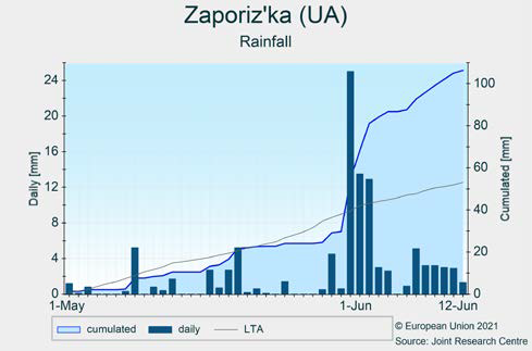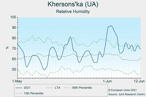 Сильные дожди и выраженный дефицит солнечного света с конца мая затронули большую часть юга и востока Украины. Хотя погодные условия до этого были благоприятными и большая часть посевов находится в хорошем состоянии, этот конкретный фактор потенциально может снизить прогноз, который был особенно позитивным.