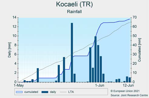В центральных регионах Анатолии (например, Анкара, Конья, Кайсери) период засухи, зарегистрированный с начала апреля, закончился в конце мая, когда выпало небольшое (<30 мм), но хорошо распределенное количество осадков. Температура была немного выше средней, а максимальная температура превышала 30 ° C всего в течение нескольких дней. Озимые культуры достигли стадии цветения в мае с недостаточным накоплением биомассы, и последующий период наполнения зерна был сокращен из-за засушливых условий, которые ускорили созревание сельскохозяйственных культур. Кукуруза и сахарная свекла развиваются обычными темпами благодаря орошению; однако уровень воды в водохранилищах низкий, и для обеспечения доступности воды в летний сезон необходимы дожди.