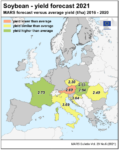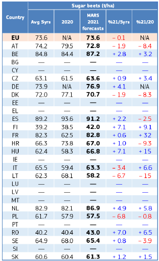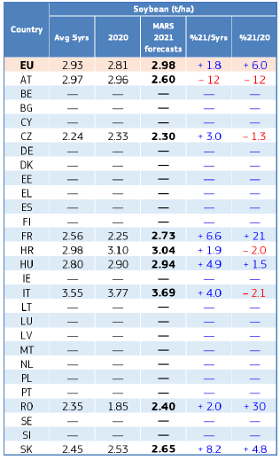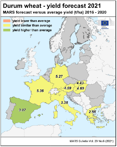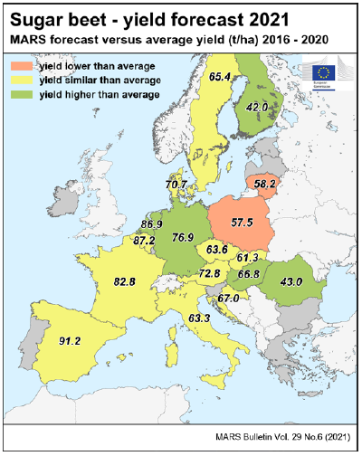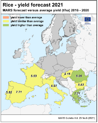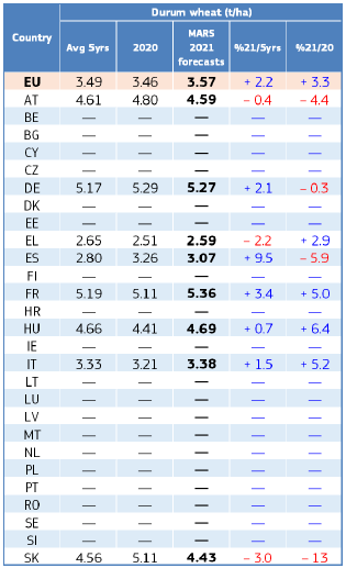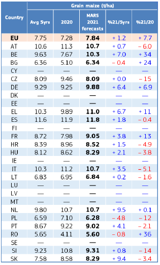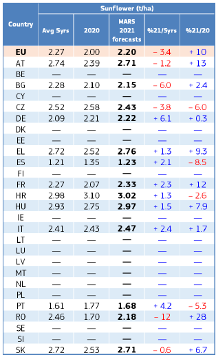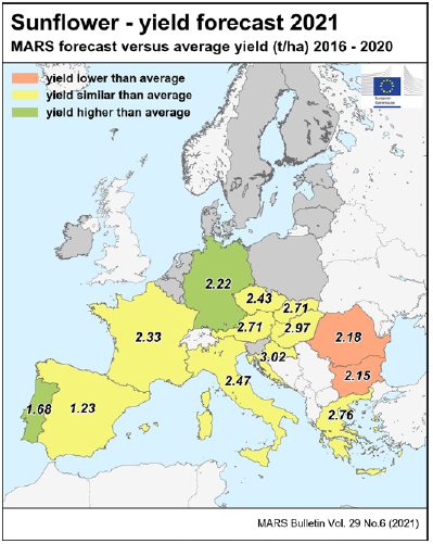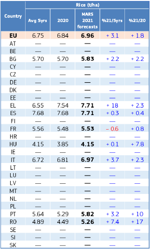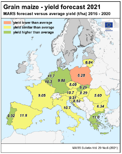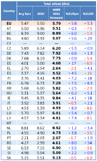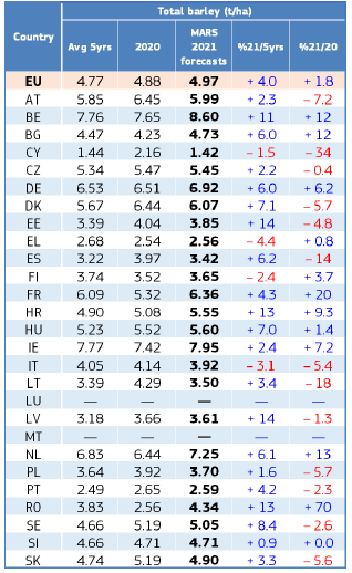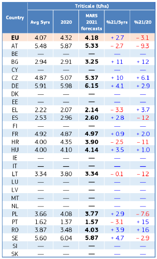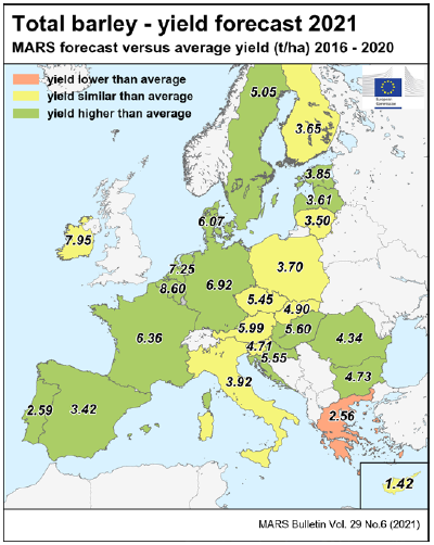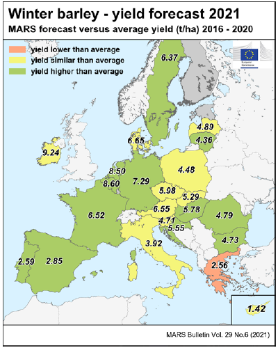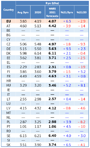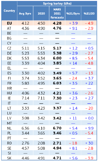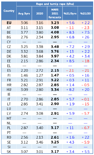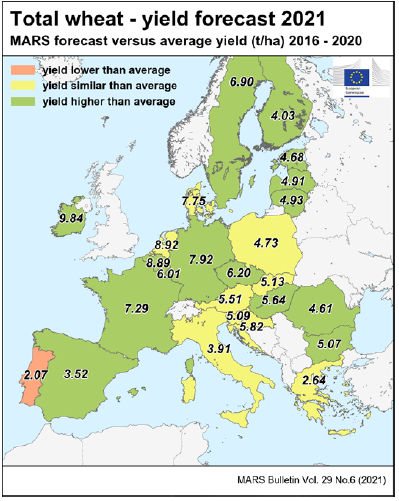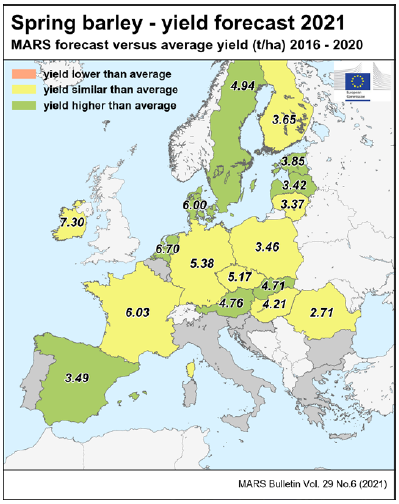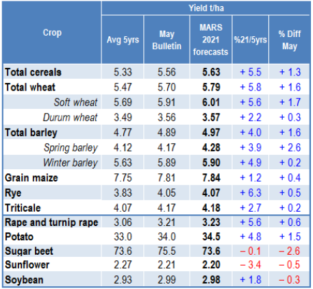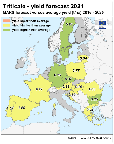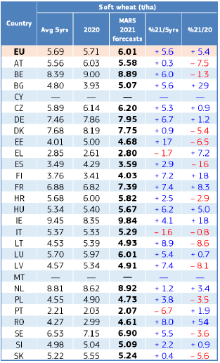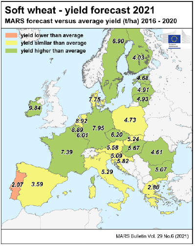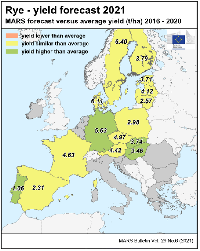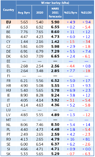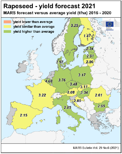 На уровне ЕС прогнозы урожайности для всех озимых культур и ярового ячменя были пересмотрены в сторону повышения. Прогноз урожайности мягкой пшеницы, ячменя, ржи и рапса в настоящее время значительно выше среднего за 5 лет уровня. В отношении яровых культур ожидания неоднозначны.