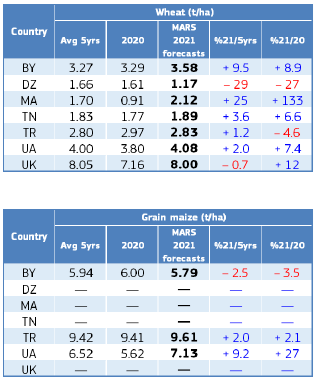 Условия также были в целом благоприятными для посевных работ, завершившихся в конце мая, и для раннего развития кукурузы. Модель MARS показывает средний темп развития посевов и накопления биомассы кукурузы. MARS сохраняет позитивный прогноз урожайности озимой пшеницы и кукурузы.