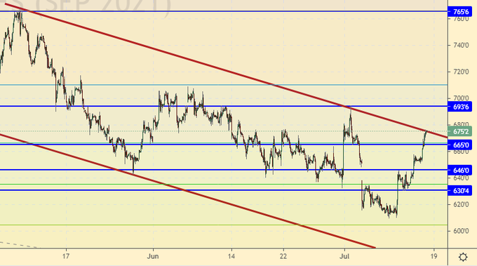 Начавший поступать на рынок новый урожай должен оказать давление на цены. Текущий ценовой всплеск на бирже можно использовать для продаж. Проход рынка выше 700.0. станет сюрпризом. Однако, даже в этом случае стоит использовать любые возможности для входа в шорт.