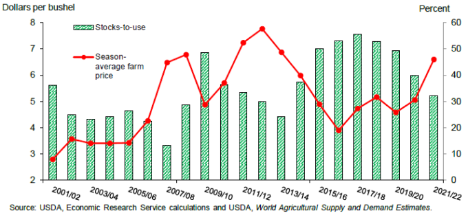 Запасы пшеницы в США в 2021/22 маркетинговом году сокращены почти на 5 процентов в этом месяце из-за двойного влияния снижения переходящих запасов с 2020/21 маркетингового года и значительного сокращения прогнозируемого производства в 2021/22 году на 152 миллиона бушелей. Снижение ожиданий по внутренним запасам, которые согласно прогнозу будут на самом низком уровне с 2007/08 года, сократит как внутреннее, так и экспортное потребление, в результате чего совокупное потребление уменьшится на 35 миллионов бушелей. Несмотря на сокращение потребления, баланс США и соотношение запасов к потреблению еще больше сократились в этом месяце, поддерживая повышение прогнозируемой средней сезонной цены на ферме на 10 центов за бушель до 6,60 долларов за бушель (рис.1).