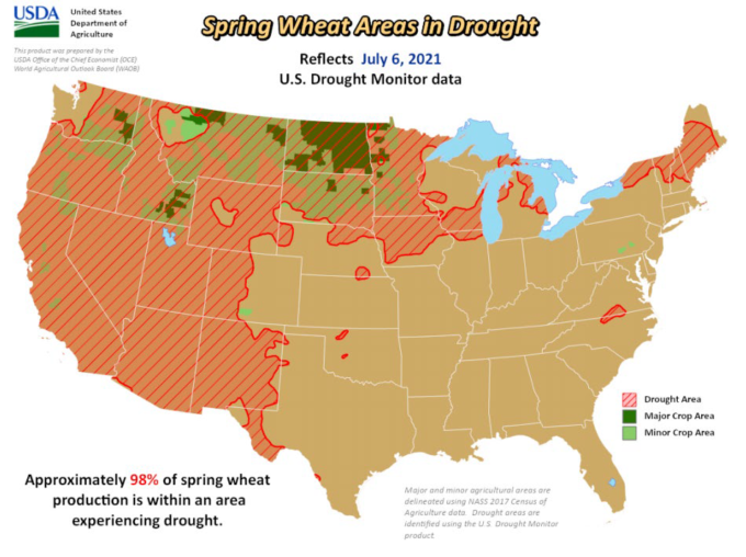 Рисунок 2. Ожидается, что повсеместная засуха на севере и западе США снизит урожайность яровой пшеницы