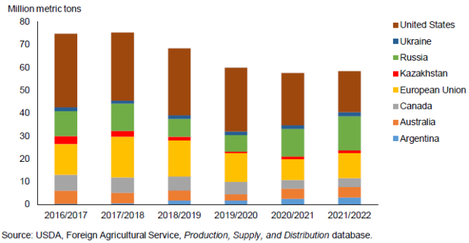 И напротив, экспорт сокращен для Канады (-500 000 до 23 миллионов) и Казахстана (-500 000 метрических тонн до 7,5 миллионов) из-за снижения оценок производства. Экспорт США также сокращен на 500 000 тонн до 24,5 млн из-за засушливых условий, которые привели к уменьшению запасов мягкой белозерной озимой пшеницы и яровой пшеницы с высоким содержанием протеина.