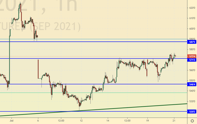 Упрямо лезем закрывать гэп. Ну и хорошо. Правильно, надо быть упрямым. И вот оттуда, от 580.0 мы и будем продавать в расчете на то, что ливни закончатся, а некоторый избыток продовольствия на рынке останется.