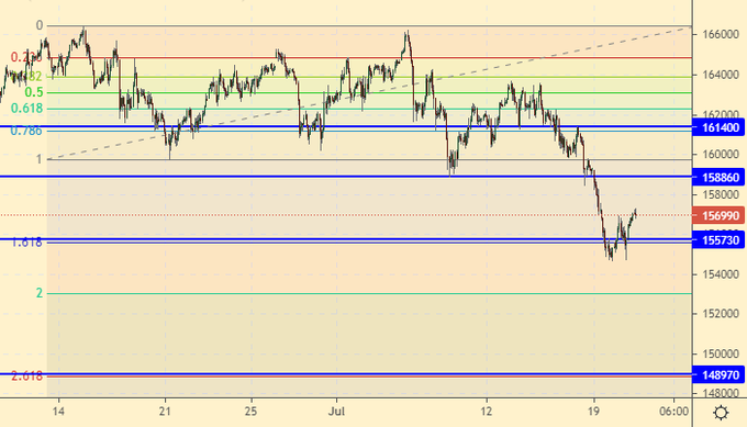 Возврат к 159000 можно использовать для продаж. Рынку вряд ли удастся сломать негативную тенденцию, которая только набирает обороты. Ливни в Китае сегодня еще больше сгустят краски и какой-либо рост на глобальном фондовом рынке можно будет воспринимать только как отсрочку перед следующим падением.
