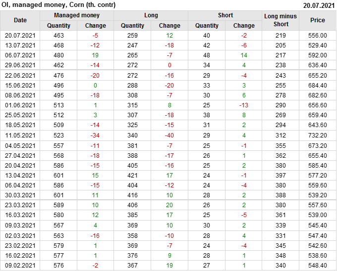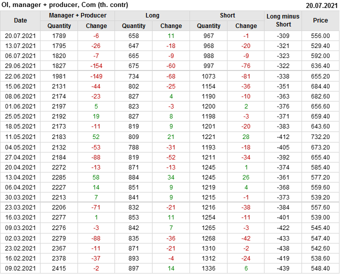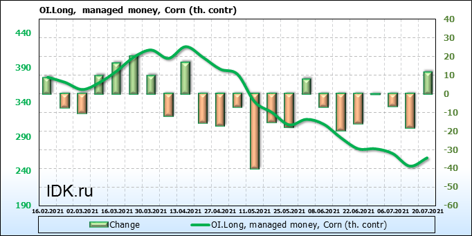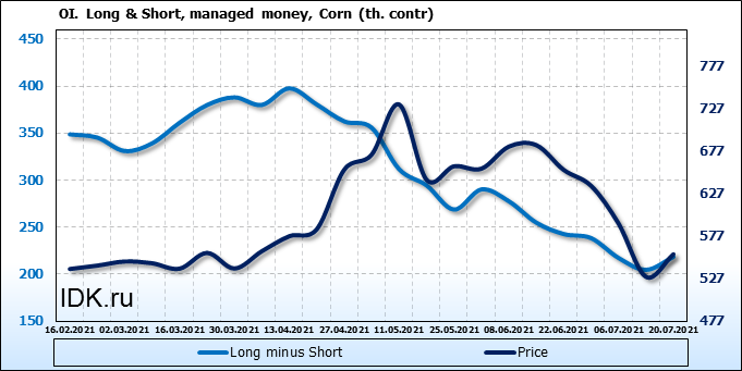 За прошлую неделю, 14.07.21 — 20.07.21, разница между длинными и короткими позициями управляющих увеличилась на 13.7 тыс. контрактов. В тоже время, цена выросла на 26.6 цента.