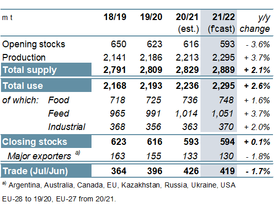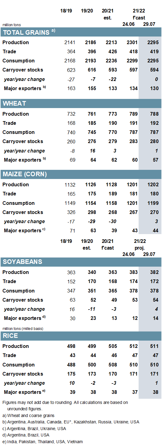 В основном из-за резкого повышения производства кукурузы (+ 74 млн тонн год к году) до нового пика, но также с учетом рекордного уровня производства пшеницы (+ 15 млн), ожидается, что в 2021/22 году общемировое производство зерновых культур (пшеница и фуражное зерно) будет самым высоким за всю историю — 2 295 млн (+ 4% год к году). Включая увеличение для продовольственного (+ 12 млн. тонн год к году) и промышленного потребления (+ 7 млн.), но с наибольшим ростом для кормового сектора (+ 37 млн.) мировое потребление, согласно прогнозу, вырастет на 3%, до рекордно высокого уровня в 2 295 млн. Поскольку рост запасов сопровождается увеличением спроса, прогнозируется, что мировые остатки на конец 2021/22 года изменятся незначительно и составят 594 млн тонн. Поскольку более крупные поставки в некоторые страны (особенно в Ближневосточную Азию) могут не полностью компенсировать снижение объемов импорта в Китай (но при этом они все еще находятся на исторически высоком уровне), общий объем мировой торговли зерном, как ожидается, сократится на 7 млн. тонн по сравнению с предыдущим годом до 419 млн.
