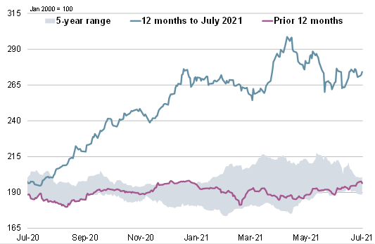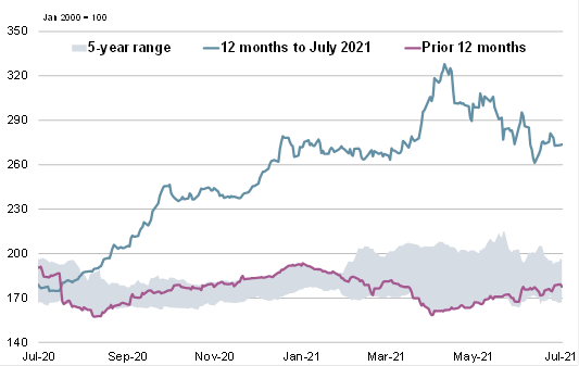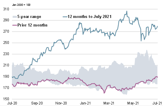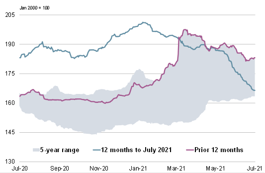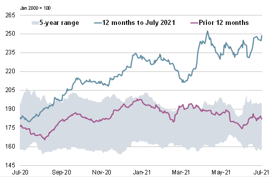 Средние мировые экспортные цены в июле демонстрировали смешанную динамику, но в целом IGC GOI вырос на 3%, что представляет собой сильное повышение по сравнению с прошлым годом.