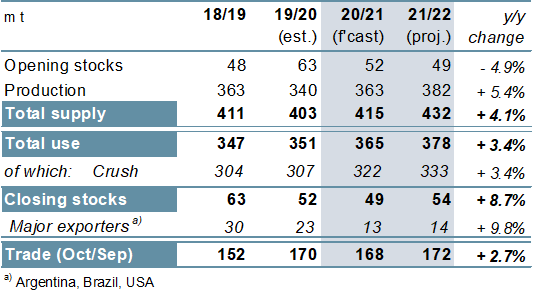 Прогнозируется, что в 2020/21 году мировая торговля соевыми бобами сократится на 1% по сравнению с предыдущим годом из-за умеренного сокращения поставок в Китай после их значительного роста в предыдущем году. Прогнозируется, что в 2021/22 году мировое производство вырастет на 19 млн тонн год к году до рекордных 382 млн, что в первую очередь связано с увеличением площадей у основных производителей. Ожидается, что потребление вырастет на 3% год к году до нового пика, в то время как остатки могут вырасти впервые за три сезона, в том числе ожидается небольшой рост у основных экспортеров. Предварительно ожидается, что мировой спрос на импорт вернется к росту в 2021/22 году на фоне небольшого увеличения покупок в Азии.