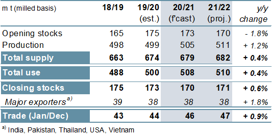 Мировое производство риса в 2021/22 году прогнозируется на рекордном уровне в 511 млн тонн (505 млн) благодаря росту у основных азиатских производителей. Ожидается, что рост населения будет способствовать умеренному увеличению потребления, хотя сокращение кормового потребления в Китае потенциально замедлит рост. Прирост в Индии и Китае поддержит небольшое увеличение остатков. Несмотря на неопределенность, связанную с COVID-19, и повышенные расходы на контейнерные перевозки, ожидается, что торговля будет расти за счет спроса в Африке.