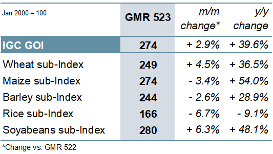 При сильном росте экспортных цен на пшеницу и соевые бобы, перевесившем снижение на другие компоненты, индекс зерновых и масличных культур IGC (GOI) вырос на 3% по сравнению с прошлым месяцем.