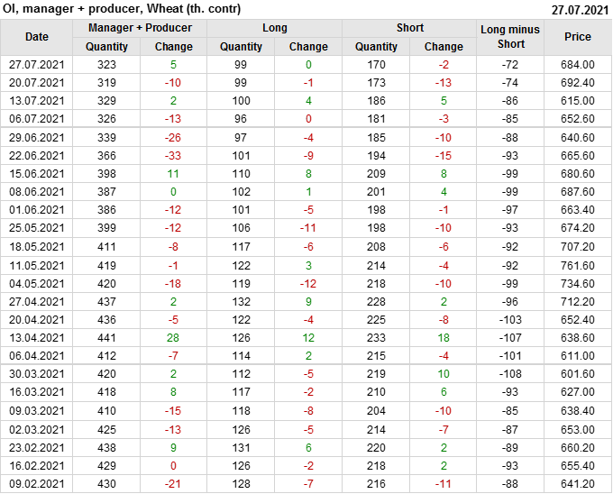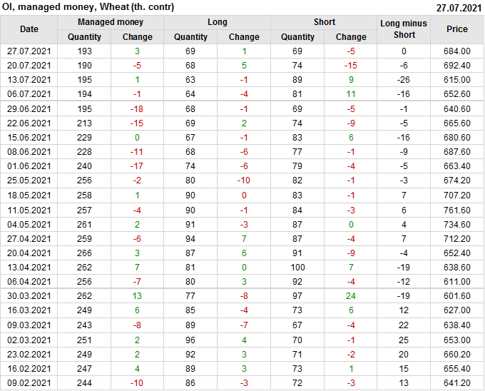 За прошлую неделю, 21.07.21 — 27.07.21, разница между длинными и короткими позициями управляющих увеличилась на 5.7 тыс. контрактов. В тоже время, цена упала на 8.4 цента.