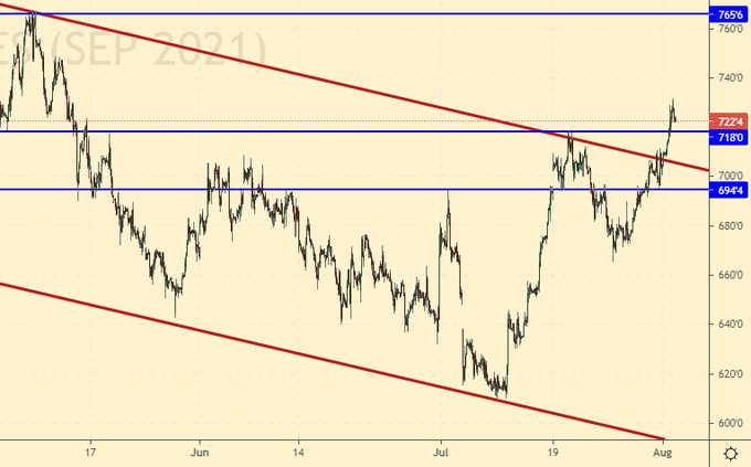 Рынок пшеницы отчасти неожиданно для нас ушел выше 715.0, что предполагает ход к 750.0. Пока вопрос о способности рынка расти на фоне нового урожая остается открытым. Те же египтяне будут стремиться всеми силами сбивать цены на тендерах, что они уже делают, просто отказывая в покупке зернотрейдерам. И тут начинается игра нервов, GASC будет смотреть на рынок, а экспортеры будут считать, сколько пшеницы осталось в запасе у Каира. Если потребители не будут паниковать, то им удастся получить приемлемые цены для себя осенью.
