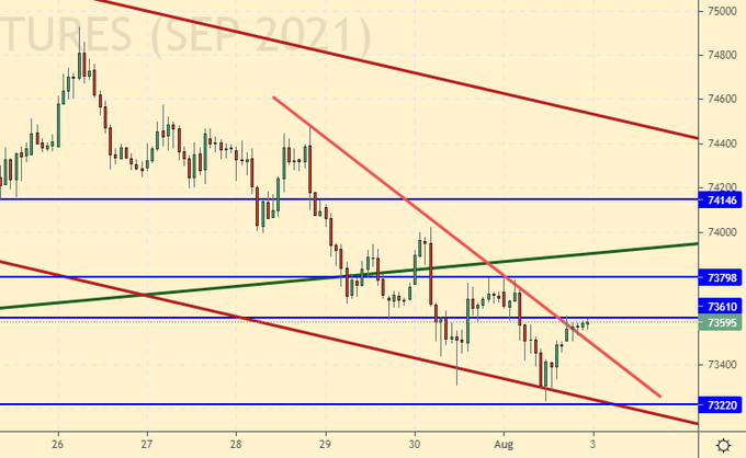 Продажа: нет. Кто в позиции от 74600, перенесите стоп на 73700. Цель: 70000.