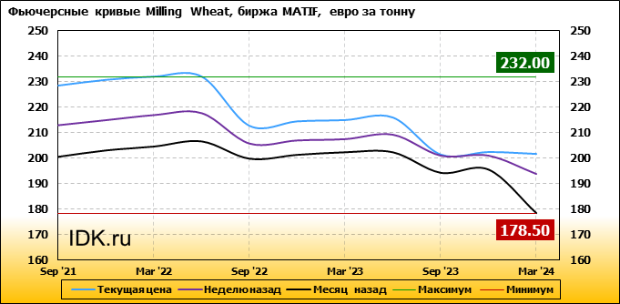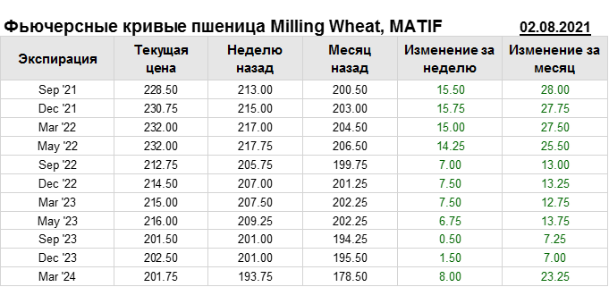 На 02.08.2021 стоимость пшеницы Milling Wheat на бирже MATIF по контракту Sep ’21 составила 228.5 евро за тонну. За прошедшую неделю стоимость пшеницы Milling Wheat выросла на 15.5 евро/тонна. Как мы видим на графике, фьючерсная кривая имеет периоды, когда более дальний фьючерс дешевле ближнего. Состояние бэквардации наблюдаем на следующих контрактах: Sep ’22; Sep ’23; Mar ’24. Таким образом, трейдеры предполагают, что возможно превалирование предложения над спросом в указанные периоды.