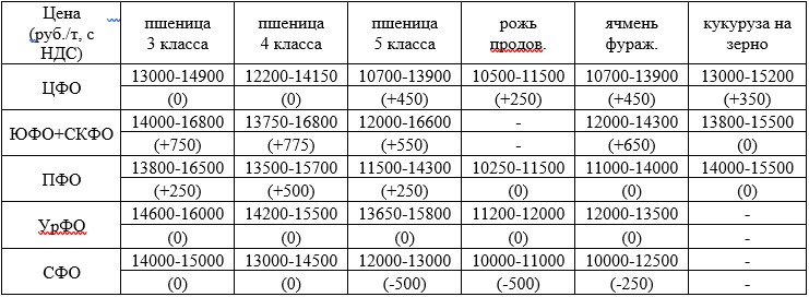 Стоимость зерна на Урале сохранилась на уровне прошлой неделе, а в Сибири пшеница 5-го класса и продовольственная рожь подешевели на 500 руб./т, фуражный ячмень – на 250 руб./т.