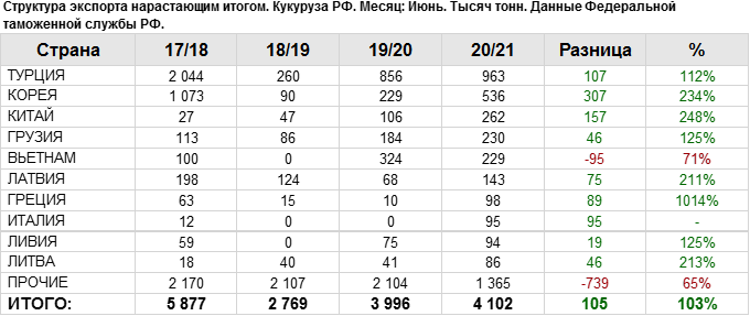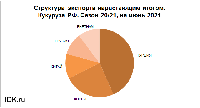 Объем поставок кукурузы на экспорт за период с июля 2020 года по июнь 2021 года в Турцию составил 962.86 тыс. тонн, что на 106.57 тыс. тонн больше объема поставок в данную страну в прошлом сезоне на тот же отчетный месяц.