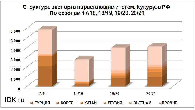 Структура экспорта кукурузы из России нарастающим итогом по сезонам