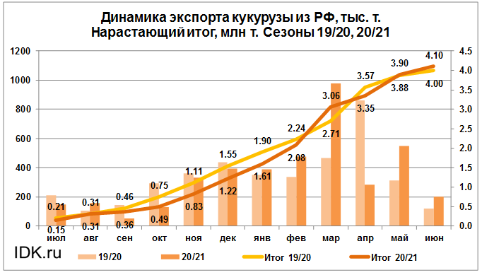 Объем поставок кукурузы на экспорт за период с июля 2020 года по июнь 2021 года в Китай составил 262.37 тыс. тонн, что на 156.71 тыс. тонн больше объема поставок в данную страну в прошлом сезоне на тот же отчетный месяц.