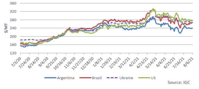 С момента публикации июльского отчета WASDE, основные экспортные цены менялись разнонаправленно. Бразильские цены выросли на 15 долларов за тонну до 267 долларов, при этом ожидания производства выглядят довольно слабыми после новых сообщений о повреждении урожая кукурузы сафринья заморозками. В то время как бразильские котировки резко выросли, международный интерес обратился к Аргентине, что привело к скачку цены на 21 доллар за тонну до 240 долларов. Украинские цены снизились на 6 долларов за тонну до 268 долларов на фоне ожиданий рекордного урожая. Цены в США снизились на 8 долларов за тонну до 276 долларов, что отражает замедление экспорта старого урожая и слабую конкурентоспособность по сравнению с другими источниками экспорта, такими как Аргентина.