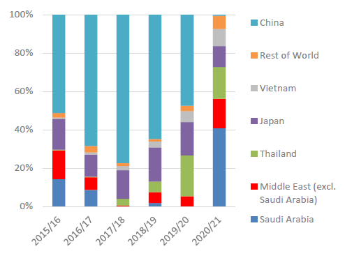 После высокого урожая экспорт ячменя из Австралии резко вырос, поскольку экспортеры успешно перенаправили экспорт кормового ячменя, ранее предназначавшегося для Китая, на другие азиатские рынки, в частности, Таиланд, Японию и Вьетнам. Фактически, более высокий урожай 2020 года позволил австралийскому ячменю восполнить дефицит фуражного зерна в Азии. Австралийский ячмень также нашел применение на рынках Ближнего Востока, в первую очередь Саудовской Аравии. За первые 7 месяцев 2020/21 года Саудовская Аравия перешла от импорта 70 000 тонн ячменя за тот же период предыдущего года к импорту 2,5 миллионов, что составляет 44 процента экспорта ячменя из Австралии.