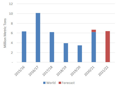 Изменения на мировом рынке для 2021/22 МГ (тыс. тонн).