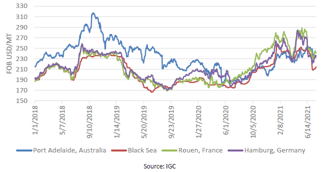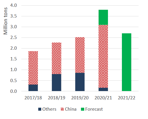Неясно, сохранятся ли текущие темпы экспорта ячменя из Австралии, поскольку рост спроса со стороны стран Ближнего Востока в этом году частично объясняется ограничениями предложения и решениями экспортной политики их обычных поставщиков (поставщики из Аргентины и ЕС перенаправили поставки в Китай), а также высокими ценами на корма. Таким образом, цены на австралийский фуражный ячмень стали намного более конкурентоспособными, особенно по сравнению с альтернативными источниками для импорта Саудовской Аравии, такими как Россия и Украина; однако возврат к более нормализованным ценам и структуре торговли, вероятно, окажет давление на экспорт ячменя из Австралии в свете сохранения запретительных китайских пошлин. Австралийские производители ячменя уже внесли коррективы, учитывающие потенциальные трудности с поиском экспортных рынков в 2021/22 году, перенаправив некоторые посевные площади ячменя на посевы рапса, воспользовавшись высокими ценами.