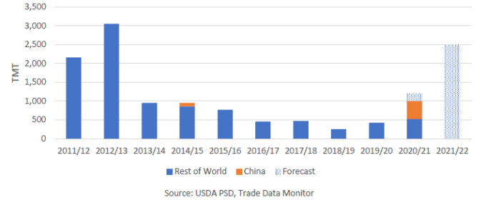 Прежде чем в мае 2020 года министерство торговли Китая ввело пошлину в размере 80,5% на австралийский ячмень, на Китай приходилось примерно две трети экспорта ячменя из Австралии. Однако в 2020/21 году в Китай было экспортировано только 34 000 тонн ячменя (что составляет 0,5 процента от 6,2 миллиона, экспортированных на данный момент в 2020/21 году), полностью пришедшихся на ноябрь. С тех пор в течение 7 месяцев ячмень из Австралии в Китай не экспортировался.