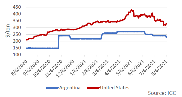Соединенные Штаты, как крупнейший в мире производитель и экспортер сорго, являются основным поставщиком этого зерна в Китай. Однако из-за уровня спроса Китая относительно производства баланс сорго в США в 2020/21 году оказался очень напряженным. Конечные остатки в настоящее время прогнозируются как самые низкие в базе данных Министерства сельского хозяйства США. Помимо ограниченного баланса США, аргентинское сорго торгуется значительно дешевле, чем сорго в США, что может отражать более низкую вкусовую привлекательность для животных из-за более высокого уровня танинов, а также выиграло от неуклонного снижения курса аргентинского песо по отношению к доллару США. Эти факторы делают аргентинское сорго очень конкурентоспособным по цене зерном на мировом рынке.