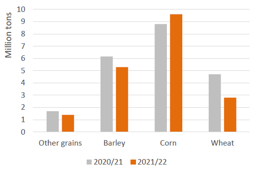 | Соединенное Королевство | Кукуруза | Импорт | 2 200 | 2 400 | 200 | Небольшое снижение доступности других кормовых зерновых |