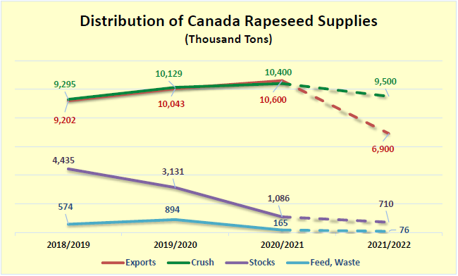 Жаркие и засушливые условия на большей части канадских прерий значительно повлияли на производство рапса в этом сезоне. Прогноз производства на 2021 год снижен более чем на 4 миллиона тонн в этом месяце до 16,0 миллионов. Средняя урожайность снижена почти на 20 процентов, в то время как уборочная площадь сокращена из-за ожидаемого отказа от уборки или увеличения уборки на фураж. При более низком урожае и уменьшении начальных остатков по сравнению с прошлым сезоном, запасы рапса, согласно прогнозу, сократятся более чем на 20 процентов до самого низкого уровня почти за 10 лет.