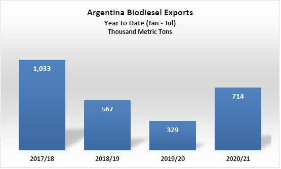 Ограничения на поездки из-за COVID-19 в 2020 году снизили спрос на биодизельное топливо как на внутреннем, так и на экспортном рынках. Кроме того, низкие цены на нефть, наблюдавшиеся в 2020 году, также ограничили спрос на биодизельное топливо, что увеличило доступность соевого масла для экспорта в прошлом году. С возвращением к более высоким ценам на нефть и ослаблением ограничений на поездки на многих рынках спрос на биодизельное топливо, особенно на экспорт, растет. В наступающем году переработчики биодизеля, вероятно, будут агрессивно продавать, чтобы поддерживать работу заводов на уровне, близком к производственной мощности.