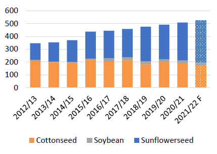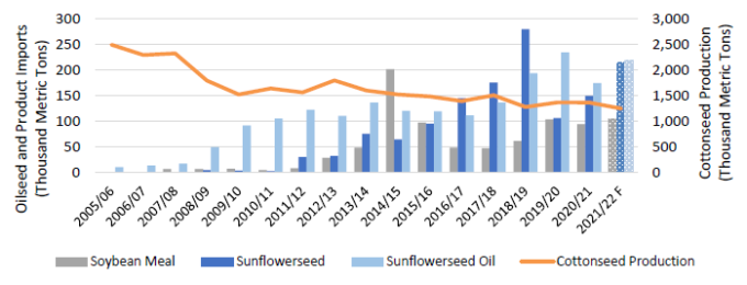 Производство хлопка, вероятно, будет отставать от спроса при относительно стабильном росте. Основным фактором, способствующим этому, станут последствия указа президента от марта 2020 года, который либерализовал рынок хлопка, отменив регулирование государством производства и цен. Неясно, какое влияние это изменение окажет на производство, поскольку приток зарубежных и внутренних инвестиций может увеличить производство хлопка, в то время как некоторые фермеры могут использовать свою расширенную автономию для перехода на альтернативные сельскохозяйственные продукты, такие как фрукты и овощи. Местные переработчики готовятся к увеличению импорта подсолнечника, поскольку ожидается, что продолжающиеся инвестиции в перерабатывающие предприятия увеличат мощности переработки подсолнечника до более чем 1 миллиона тонн к 2022 году. В связи с прогнозами рекордного мирового производства подсолнечника и производства хлопка в Узбекистане на самом низком уровне по данным USDA, прогнозируется, что 2021/22 год станет еще одним успешным годом для импорта подсолнечника и подсолнечного масла в Узбекистан.