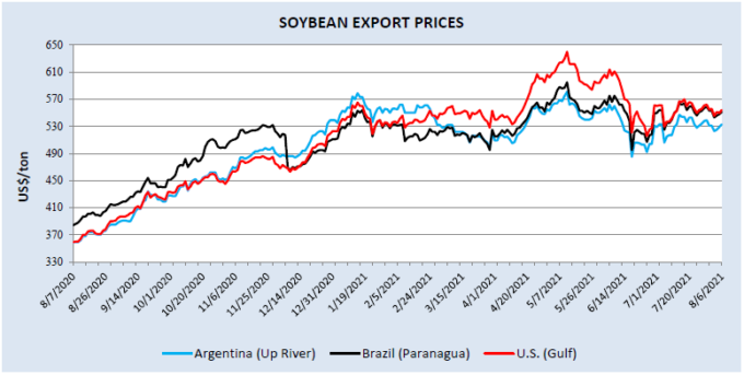 Несмотря на общее сокращение объемов торговли, в первую очередь из-за снижения спроса на сою со стороны Китая, июльские экспортные цены на сою в США, Аргентине и Бразилии оставались стабильными.