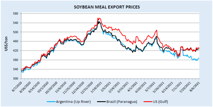Низкий уровень воды усложняет и увеличивает стоимость доставки из Росарио и Сан-Лоренцо, поскольку дополнительные запасы соевых бобов и продуктов их переработки должны доставляться дальше по реке, где глубина больше и суда могут быть полностью загружены. Хотя экспорт соевого шрота из Аргентины вырос по сравнению с прошлым годом и приблизился к нормальному уровню (апрель — июль), наблюдавшемуся в 2016, 2017 и 2019 годах, объемы могли бы быть еще выше, если бы не возникали логистические препятствия и дополнительные расходы, о чем свидетельствует высокие темпы экспорта бразильского соевого шрота.