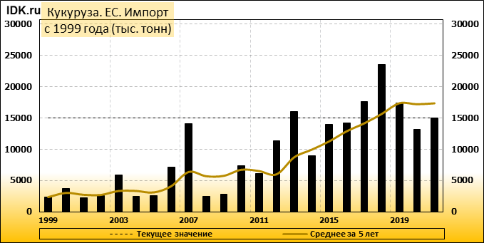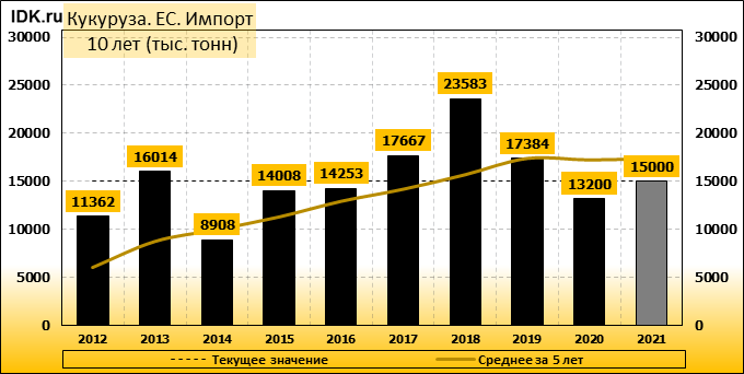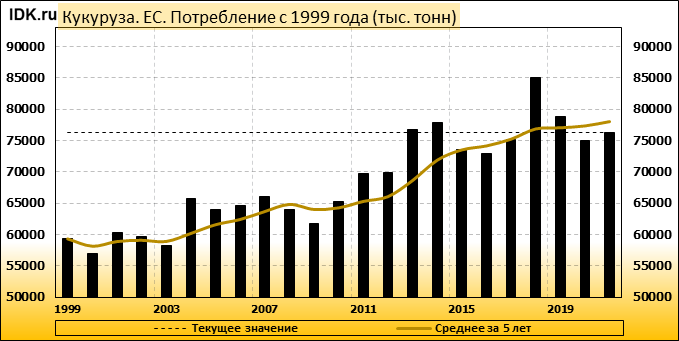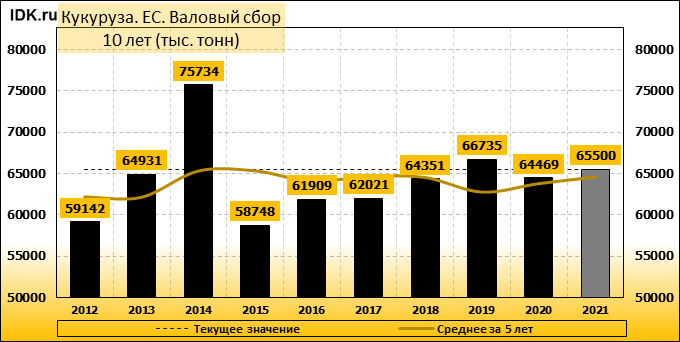 Министерство сельского хозяйства США прогнозирует, что в 2021/22 маркетинговом году производство кукурузы в Европейском союзе составит 65,5 млн метрических тонн, что на 1,2 млн тонн, или 2 процента, ниже, чем ожидалось в прошлом месяце, но в то же время на 2 процента выше урожая прошлого года и на 3 процента выше среднего урожая за 5 лет. Площадь оценивается в 8,9 млн га, что на 1 процент или 50 000 га меньше, чем ожидалось в прошлом месяце. Урожайность оценивается в 7,40 тонны с гектара, что на 1 процент меньше, чем прогнозировалось в прошлом месяце, но на 4 процента больше, чем в прошлом году.