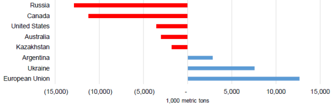 Украина, Австралия и ЕС частично компенсируют это сокращение совокупным увеличением производства на 4,9 млн метрических тонн. Согласно прогнозу, Украина будет иметь рекордные показатели производства и урожайности благодаря оптимальным условиям выращивания. Производство пересмотрено в сторону увеличения на 3,0 млн тонн до 33,0 млн (рост на 30% по сравнению с прошлым годом), а урожайность оценивается в 4,46 тонн / га (на 20% выше, чем в прошлом году). Австралия является производителем со вторым по величине увеличением прогноза производства на 1,5 млн тонн до 30,0 млн за счет увеличения урожайности и уборочных площадей. В Австралии урожайность увеличена на 4,25 процента благодаря своевременным дождям. В ЕС производство увеличено на 0,4 миллиона тонн до 138,6 миллиона. Несмотря на то, что урожайность была пересмотрена в сторону увеличения, из-за чрезмерных дождей сбор урожая задерживается и возникает озабоченность по поводу качества зерна. Производство пересмотрено в сторону увеличения как для Франции (+200 000 тонн до 38,3 млн), так и для Румынии (+500 000 тонн до 10 млн). Прогнозы для Германии и Венгрии снижены на 250 000 тонн и 50 000 тонн соответственно.