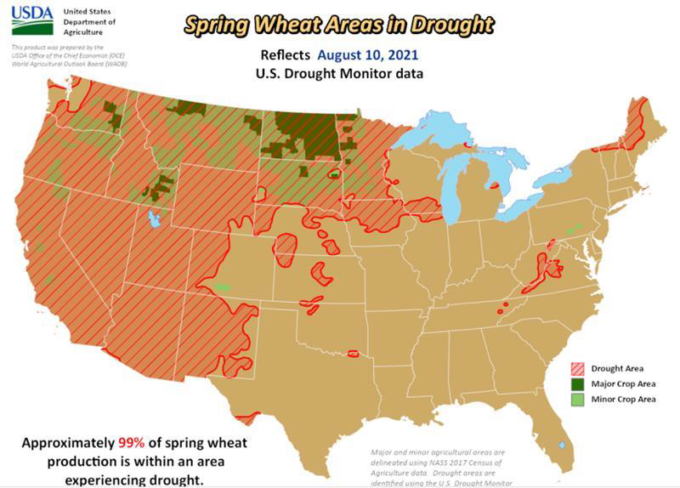 Рисунок 2. Ожидается, что повсеместная засуха на севере и западе США снизит урожайность яровой пшеницы.