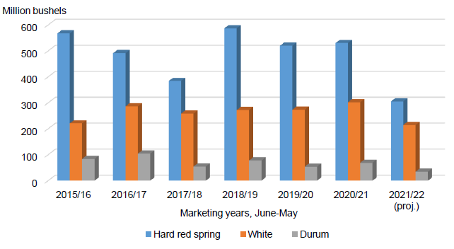 Повсеместная засуха в северных и западных регионах США ухудшила перспективы производства и экспорта в 2021/22 маркетинговом году трех классов американской пшеницы: твердой краснозерной яровой (HRS), белозерной и дурума (рисунок 3). Прогнозируется, что производство HRS упадет на 42 процента по сравнению с предыдущим годом до самого низкого уровня за более чем 30 лет, в то время как экспорт прогнозируется на самом низком уровне за более чем десятилетие. Производство яровой пшеницы в Канаде также значительно снизится в этом году из-за засухи, которая усугубляет глобальный дефицит пшеницы с высоким содержанием протеина.