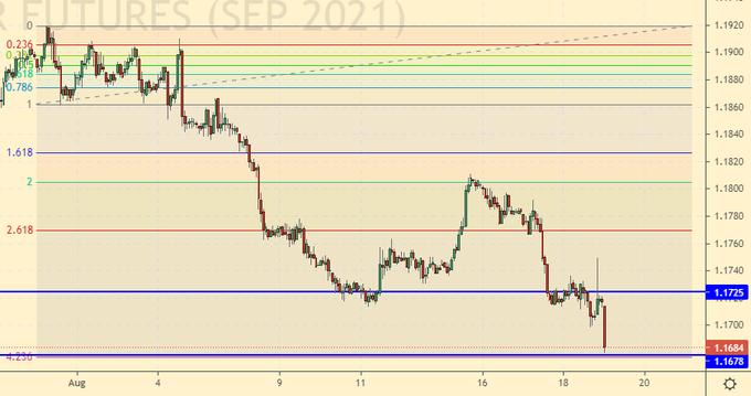 Пара достигла первой технической цели на 1.1680. Возможен откат к 1.1780 и продолжение падения. Как видим, рынок все-таки надеется на то, что в головах управленцев из ФРС что-то щелкнет и они заметят инфляцию. Это можно принять, но горизонт событий, с которым сейчас работают трейдеры, а это один год, сложно вписать в стандартные рамки.