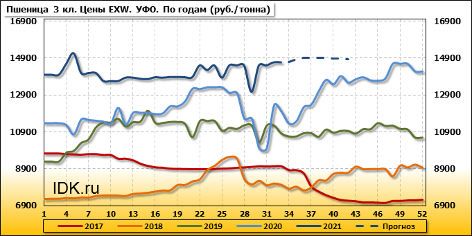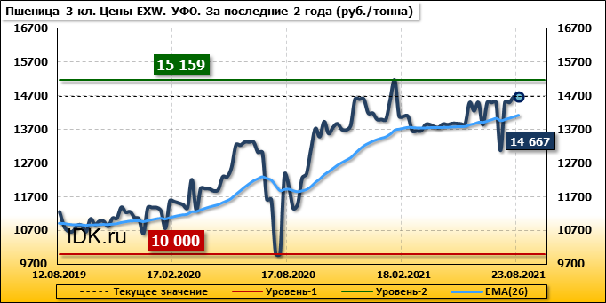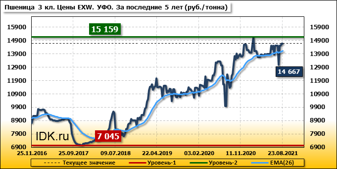 Внутренние цены на пшеницу 3 класса в Уральском федеральном округе выросли на 167 руб./т. и на данный момент составляют 14667 рублей за тонну.