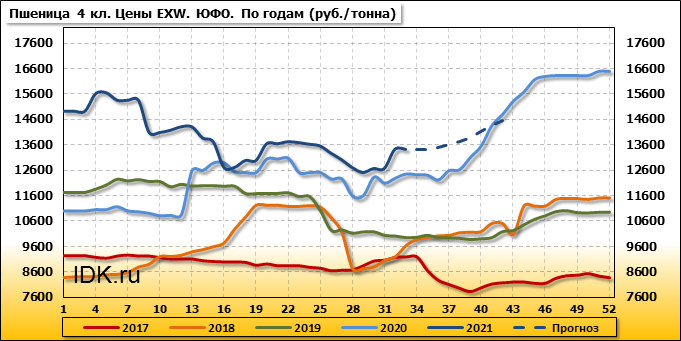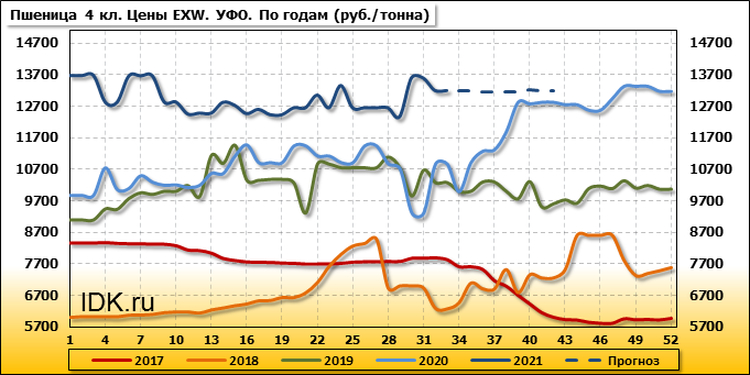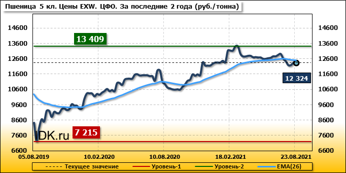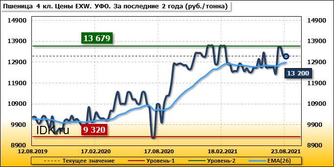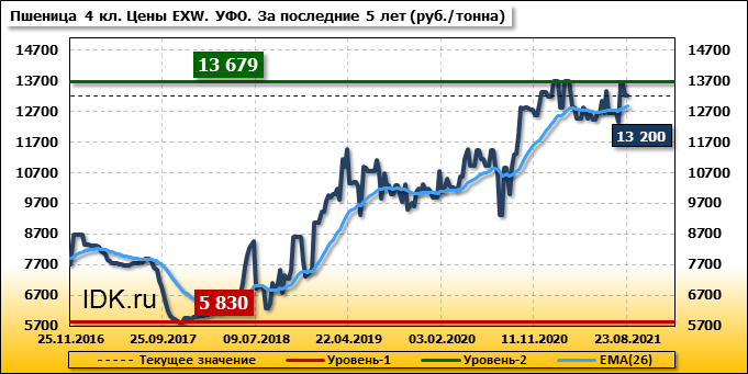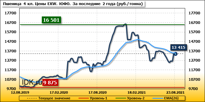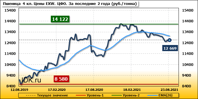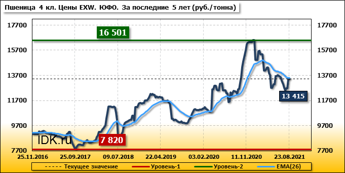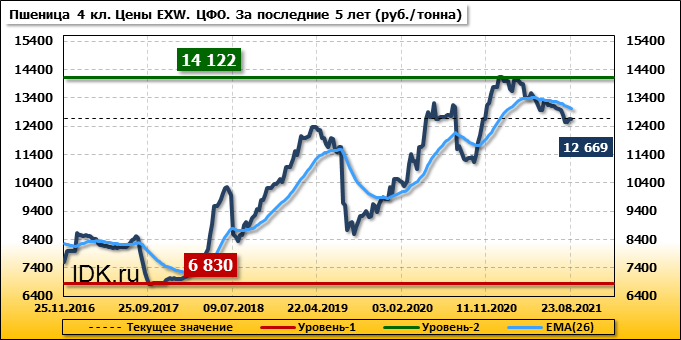 Цены на пшеницу 4-го класса поднялись на 111 руб./т. и на данный момент составляют 12669 рублей за тонну.