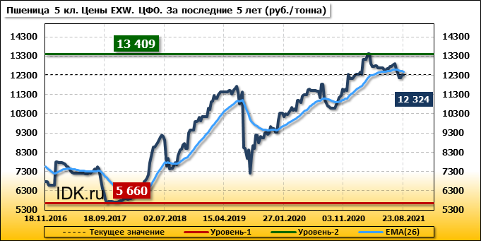 Цены на пшеницу 5-го класса повысились на 146 руб./т. и на данный момент составляют 12324 рубля за тонну.