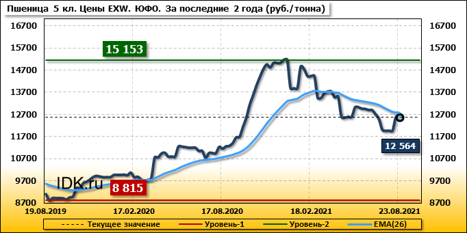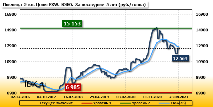 Цены на пшеницу 5-го класса повысились на 607 руб./т. и на данный момент составляют 12564 рубля за тонну.