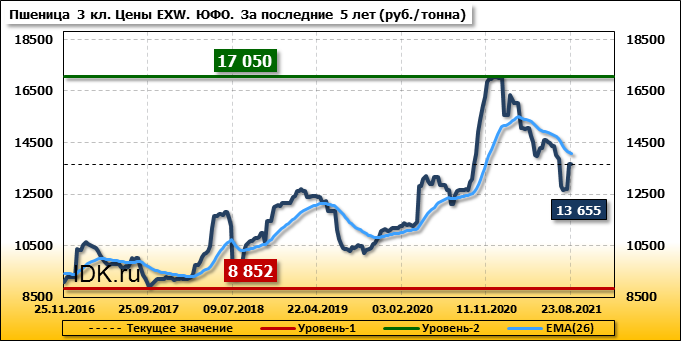 В Южном федеральном округе внутренние цены на пшеницу 3 класса выросли на 943 руб./т. и на данный момент составляют 13655 рублей за тонну.